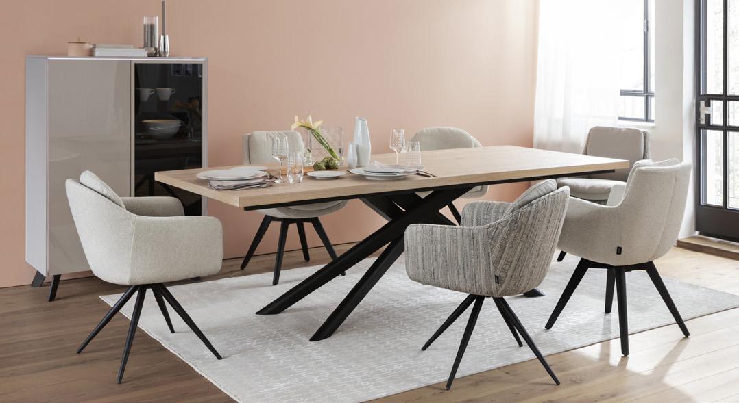 6 Esstisch «Carlotta» Massivholz-Platte mit Facette, CharakterEiche massiv, innenliegende Einhand-Falteinlage 90 cm, Sterngestell Eiche massiv, B ×T: 180 / 270 × 100 cm. 28499.6.