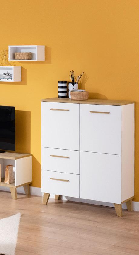 Lowboard «Olbia» Front & Korpus: kreideweiss, Deck-, Bodenplatte & Regalböden Eiche-Nebraska-Nachbildung, 3 Fächer, links & rechts, mit Kabeldurchlass, 1 Tablar im mittleren Fach, B ×T× H: 124 × 40 × 50 cm. 25398.0.2 Highboard «Olbia» Front & Korpus: kreideweiss, Deck-, Bodenplatte & Regalböden EicheNebraska-Nachbildung, Griff & Füsse Eiche massiv, 2 Türen, 5 Tablare, 2 Schubkästen, B ×T× H: 95 × 40 × 120 cm. 25398.0.1 Wandbox «Olbia» kreideweiss, kann quer oder hochkant montiert werden, B ×T× H: 40 × 19 × 19 cm. 25398.0.3