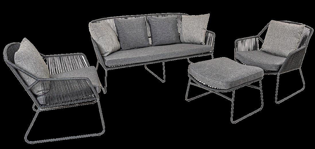 5 Gartenlounge «Acuba» Anthrazit. Gestell aus Edelstahl mit Rope bezogen. Bestehend aus: Lounge 3-Sitzer mit 5 Kissen, B ×T× H: 171 × 79 × 81 cm, 2× Sessel mit je 2 Kissen, B ×T× H: 79 × 79 × 81 cm, Hocker mit Kissen B ×T× H: 60 × 60 × 40 cm. 21738.1.4
