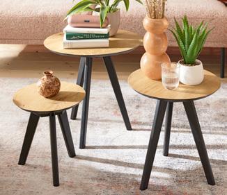 3-tlg. Set, Platten Eiche Echtholzfurnier natur, Füsse Mango massiv, schwarz lackiert, ca. Ø50/H45 cm, ca. Ø40/H40 cm, ca. Ø32/H32 cm.