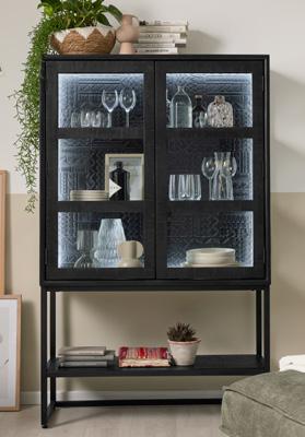 Mango massiv gebürstet, schwarz gebeizt und lackiert, Gestell Metall schwarz lackiert, Türen mit Softclose und Push-to-open-Funktion, Rückwand mit aufwändiger Verzierung und LED-Beleuchtung, ca. B100/H160/T42 cm. Diese Möbel enthalten eingebaute LED-Lampen. Die LEDs können nicht ausgetauscht werden.