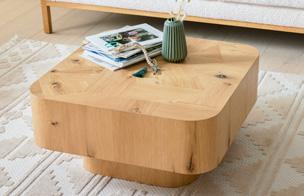 COUCHTISCH YONNA schwenkbare Tischplatte Kerneiche natur gebürstet, Säule mit Lamellen Kerneiche natur sandgestrahlt, zusätzlicher Boden aus Parsolglas, Bodenplatte Holz anthrazit. Ca. L 120 × B 70 × H 45 cm. 1.750.-.