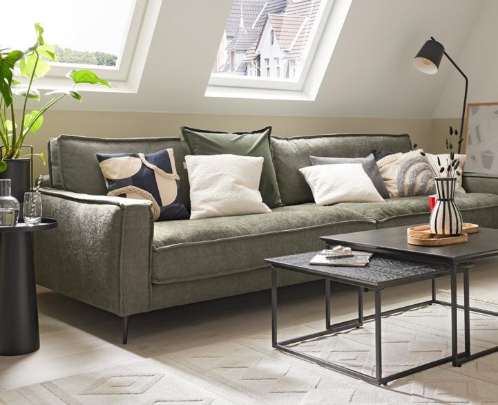 Bezug Stoff Feincord oliv, Metallfuss schwarz matt, best. aus Ottomane mit Armlehne links, 2,5-Sitzer mit Armlehne rechts, Stellmass ca. 201x301 cm, Bezug: 95% Polyester, 5% Nylon. Ohne Zierkissen.