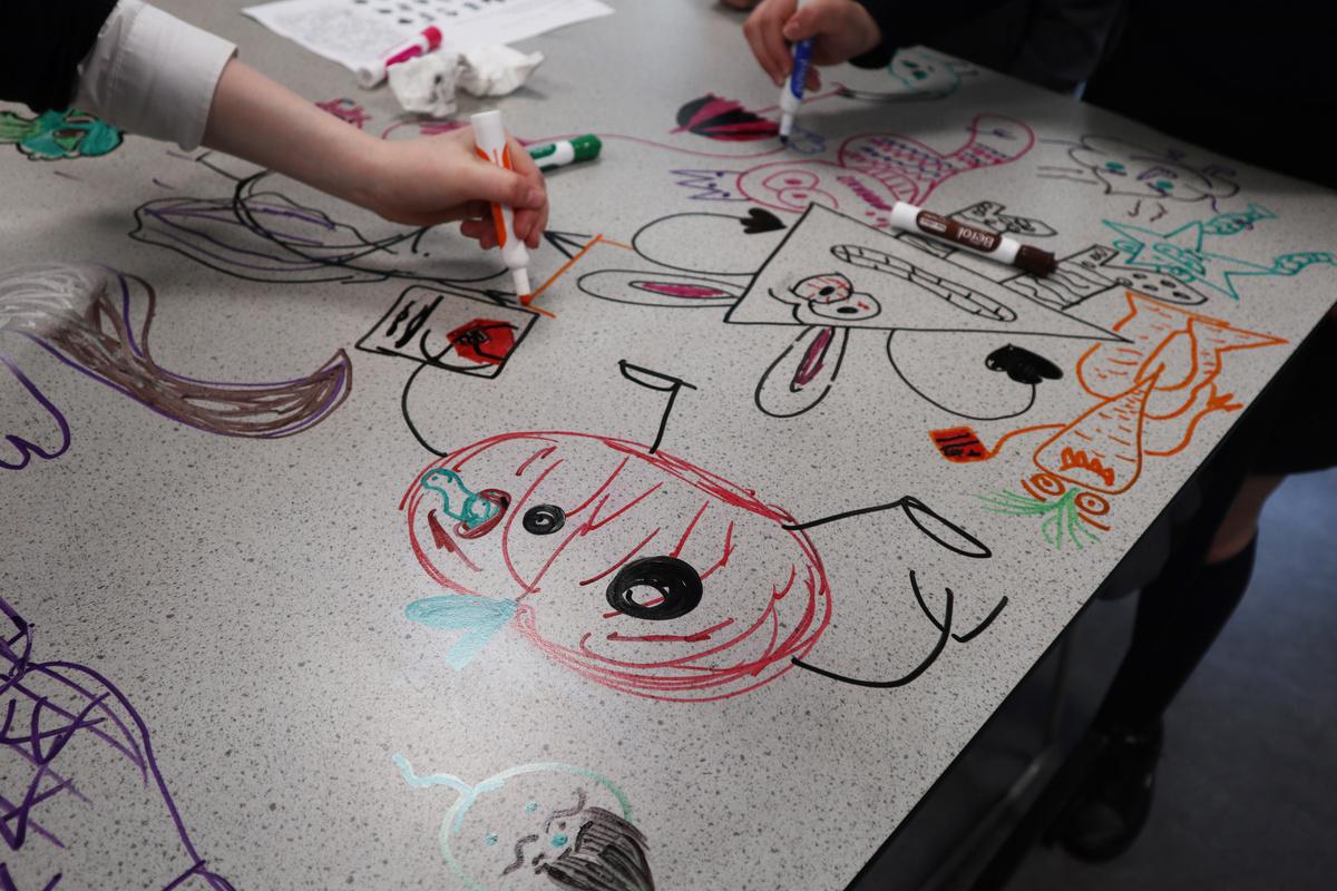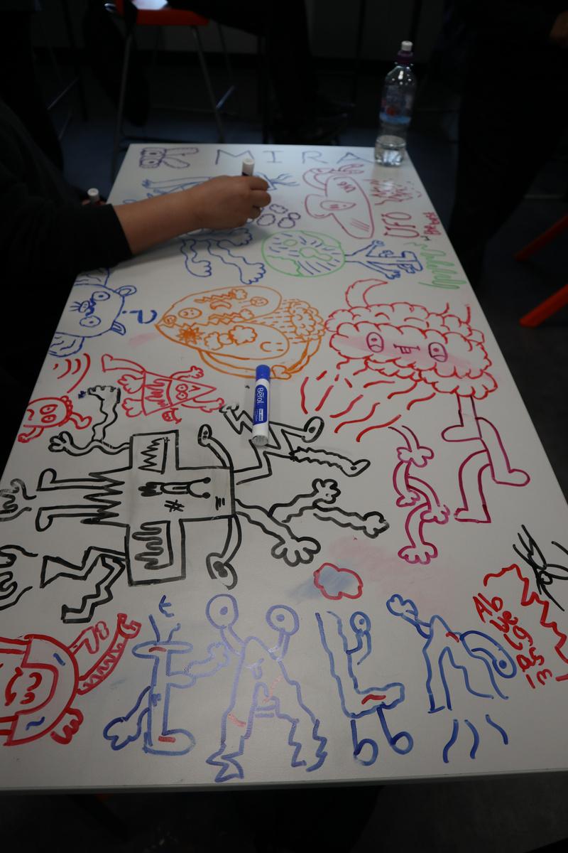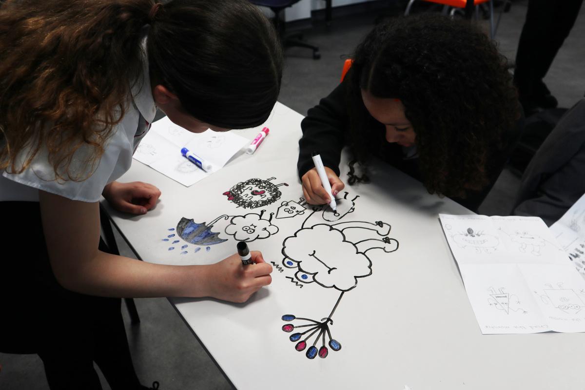 After designing their own characters in the artists style they decided to change the scale of their work. The artist is known for drawing on walls etc, so Year 7 decided to draw on the tables. Working in groups to create these great ideas.