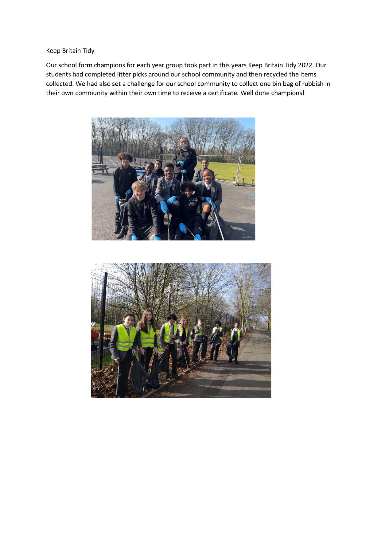 Our school form champions for each year group took part in this year's Keep Britain Tidy 2022 campaign. Our students had completed litter picks around our school community and then recycled the items collected We had also set a challenge for our school community to collect one bin bag of rubbish in their own community within their own time to receive a certificate. Well done champions!