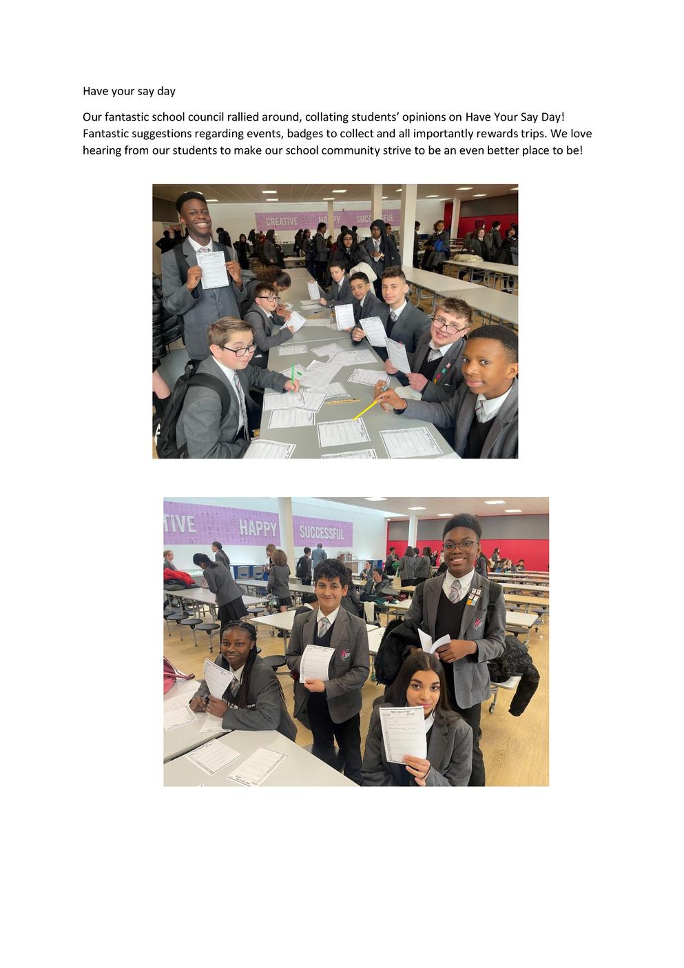 Our hardworking school council rallied around, collating students’ opinions on Have Your Say Day! Fantastic suggestions regarding events, badges to collect and all importantly rewards trips. We love hearing about the brilliant ways our students are building our school community!
