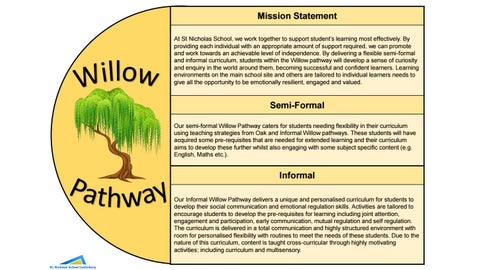 Mission Statement At St Nicholas School, we work together to support student’s learning most effectively. By providing each individual with an appropriate amount of support required, we can promote and work towards an achievable level of independence. By delivering a flexible semi-formal and informal curriculum, students within the Willow pathway will develop a sense of curiosity and enquiry in the world around them, becoming successful and confident learners. Learning environments on the main school site and others are tailored to individual learners needs to give all the opportunity to be emotionally resilient, engaged and valued.