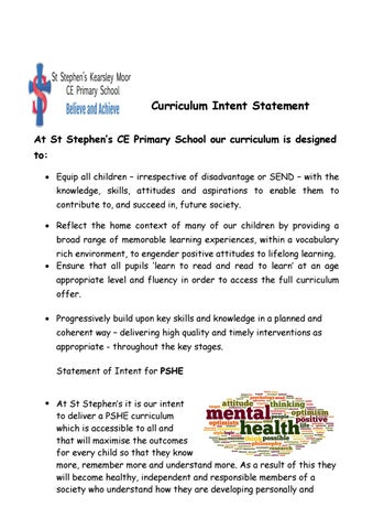 Curriculum Intent Statement At St Stephen’s CE Primary School our curriculum is designed to: Equip all children – irrespective of disadvantage or SEND – with the knowledge, skills, attitudes and aspirations to enable them to contribute to, and succeed in, future society. Reflect the home context of many of our children by providing a broad range of memorable learning experiences, within a vocabulary rich environment, to engender positive attitudes to lifelong learning. Ensure that all pupils ‘learn to read and read to learn’ at an age appropriate level and fluency in order to access the full curriculum offer. Progressively build upon key skills and knowledge in a planned and coherent way – delivering high quality and timely interventions as appropriate - throughout the key stages. Statement of Intent for PSHE At St Stephen’s it is our intent to deliver a PSHE curriculum which is accessible to all and that will maximise the outcomes for every child so that they know more, remember more and understand more. As a result of this they will become healthy, independent and responsible members of a society who understand how they are developing personally and