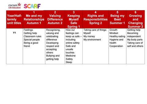 1 2 Year/Half- Me and my Valuing termly Relationships Difference unit titles Autumn 1 Autumn 2 Y1