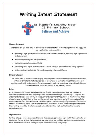 Ethos Statement The school aims to serve its community by providing an education of the highest quality within the context of Christian belief and practice. It encourages an understanding of the meaning and significance of faith, and promotes Christian values through the experience offered to all children. Our Key Christian Values are: LOVE, HOPE, FAITH, TRUST Intent At St Stephen’s C E School, we believe that our English curriculum should allow our children to confidently communicate their knowledge, ideas and emotions through their writing. Our pupils will understand and use a wide variety of vocabulary and understand the purpose of their writing. They should be able to adapt their writing for the genre they are writing in and with a knowledge of who they are writing for. They will also be confident spellers and use a range of grammatical features to enhance their writing style. Our children should be encouraged to take pride in the presentation of their writing, in part by developing a good, joined, handwriting style by the time they move to secondary school.