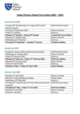 Valley Primary School Term Dates 2022 – 2023 Autumn Term 2022 Tuesday 30th & Wednesday 31st August 2022 (school closed to pupils) Thursday 1st September 2022 Friday 14th October Monday 17th October – Friday 28th October Monday 31st October 2022 Wednesday 21st December Thursday 22nd December – Tuesday 3rd January