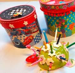 Wir schneiden und zerreissen farbiges Geschenkpapier, das wir in Collagen aufkleben. Mit Pompons und Perlen verzieren wir deine individuelle Box.