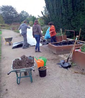Die Stiftung pflegt einige Beete im Freigelände, u.a. den Bauerngarten, den Heilpflanzengarten, den Bibelgarten oder die Wechselbepfl anzungsfläche. Die Teams treffen sich mittwochs und samstags oder nach Absprache und jäten Unkraut, mähen den Rasen, schneiden den Ilex, pfl anzen Blumen u.v.m.