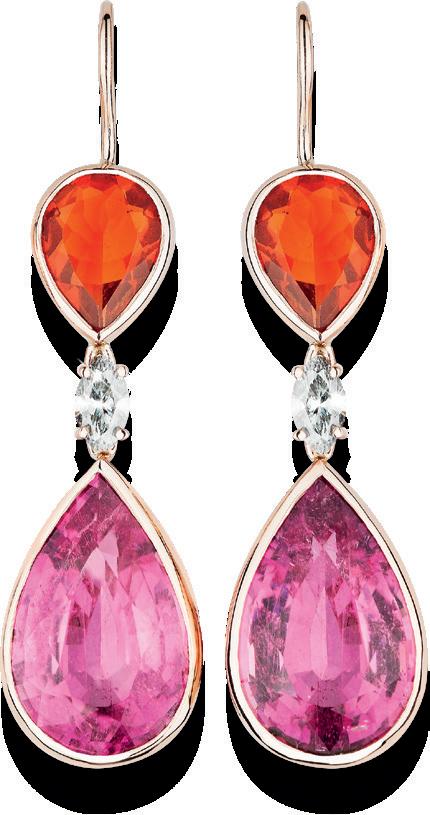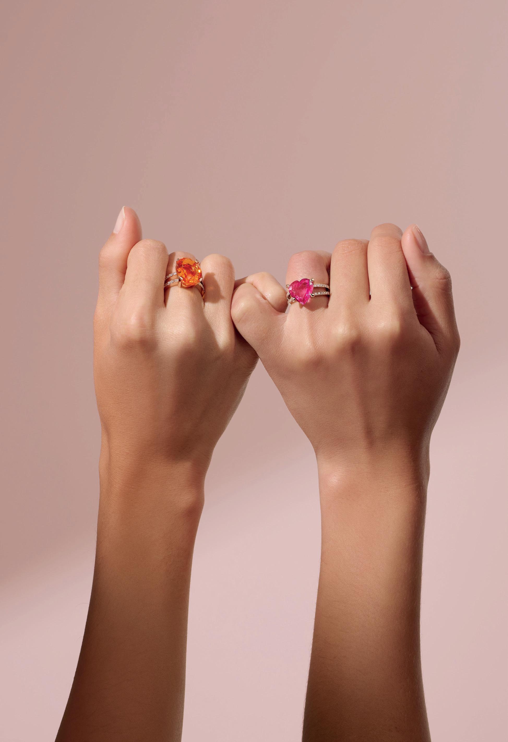 Gegensätze, Unterschiede, Kontraste. Zwei Energien – vereint in einem leuchtenden Spiel aus Neugier und Vertrauen. Feuriger Spessartit und schwarze Diamanten finden zueinander. Türkis küsst Mandaringranat und Feueropal. Gemeinsam strahlen sie stärker, tragen sich gegenseitig. Leichtigkeit trifft auf Stärke, Eleganz auf Lebenslust.