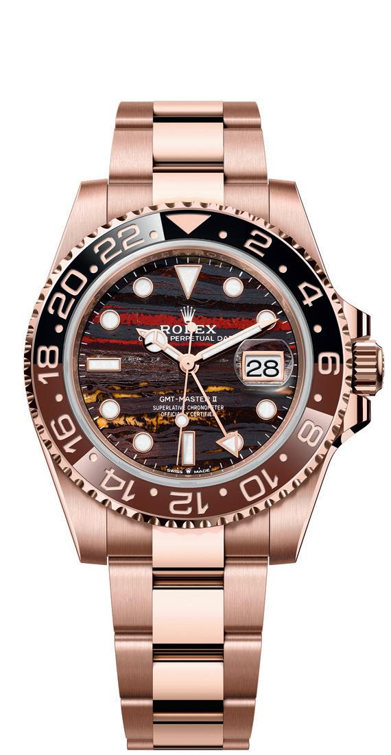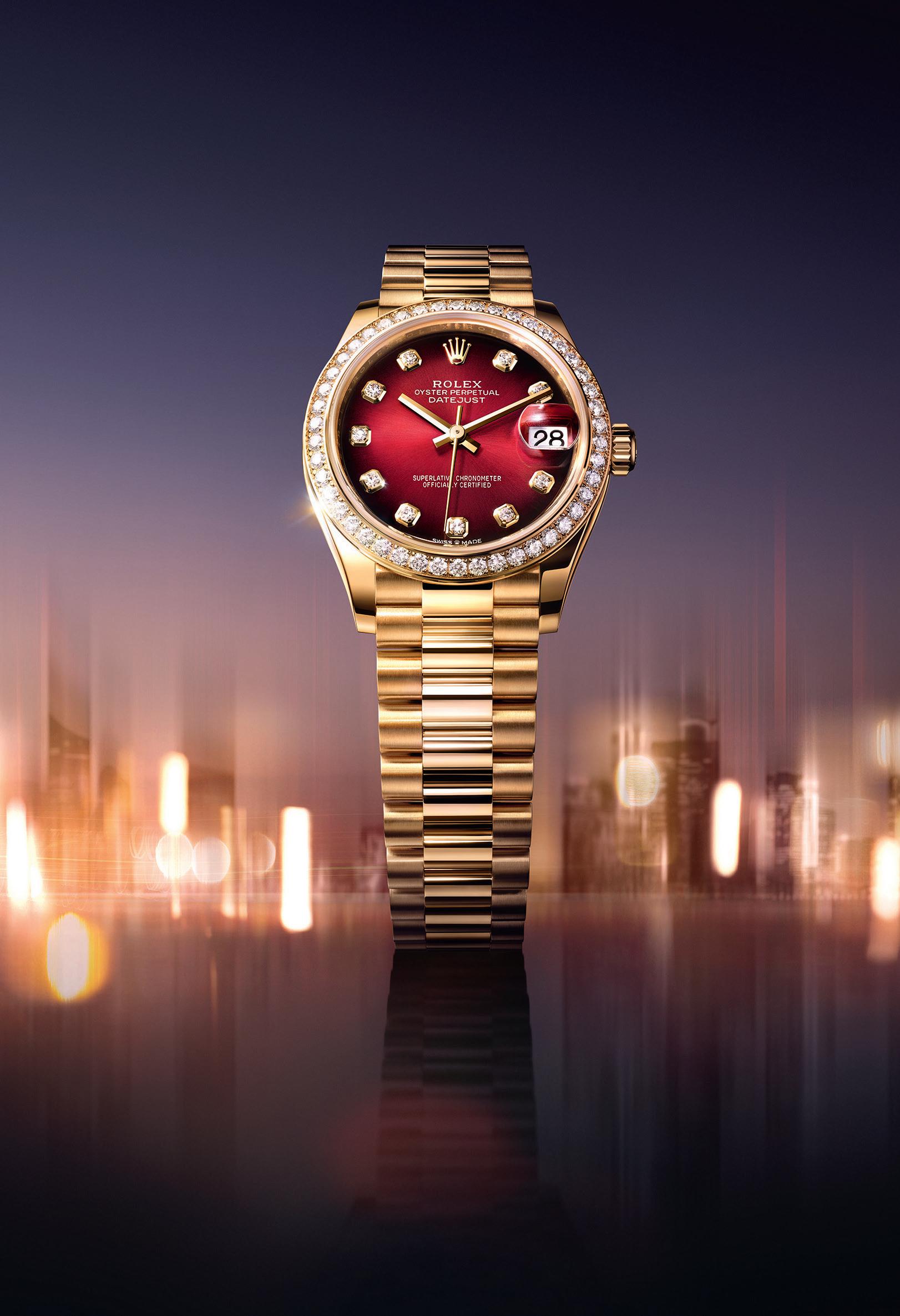 Zum ersten Mal präsentiert Rolex ein im PVD-Verfahren (Physical Vapor Deposition, physikalische Gasphasenabscheidung) eingefärbtes Zifferblatt in Rot ombré, ein Farbton, dessen Herstellung mit dieser Technik äußerst komplex ist.