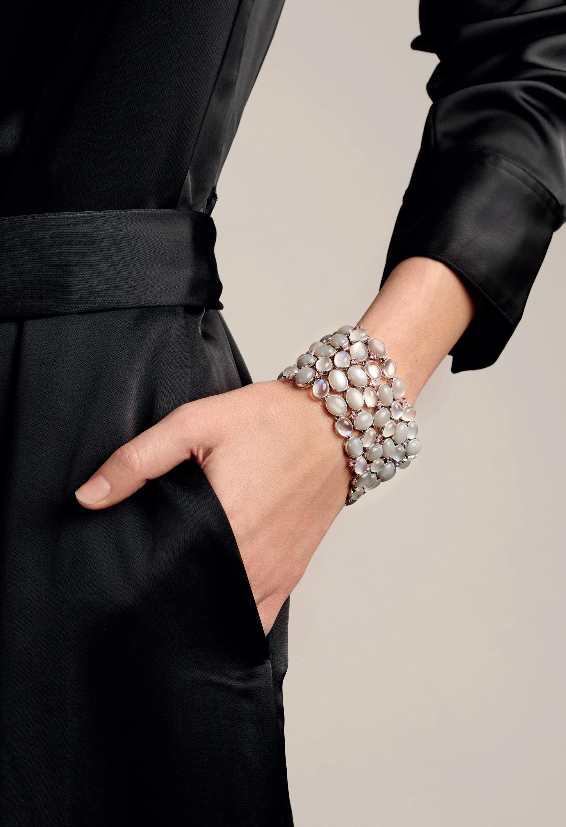 Stärke muss nicht laut sein. Der Mondstein verzaubert mit sanftem Leuchten. Geheimnisvoll schimmernd, wie Licht, das über die Haut streicht. Zwischen zarten Rosatönen und weißgoldenem Glanz entfaltet sich Anmut und Eleganz – leise, aber unvergesslich. Eine Hommage an jene Momente, die im Stillen am tiefsten berühren.