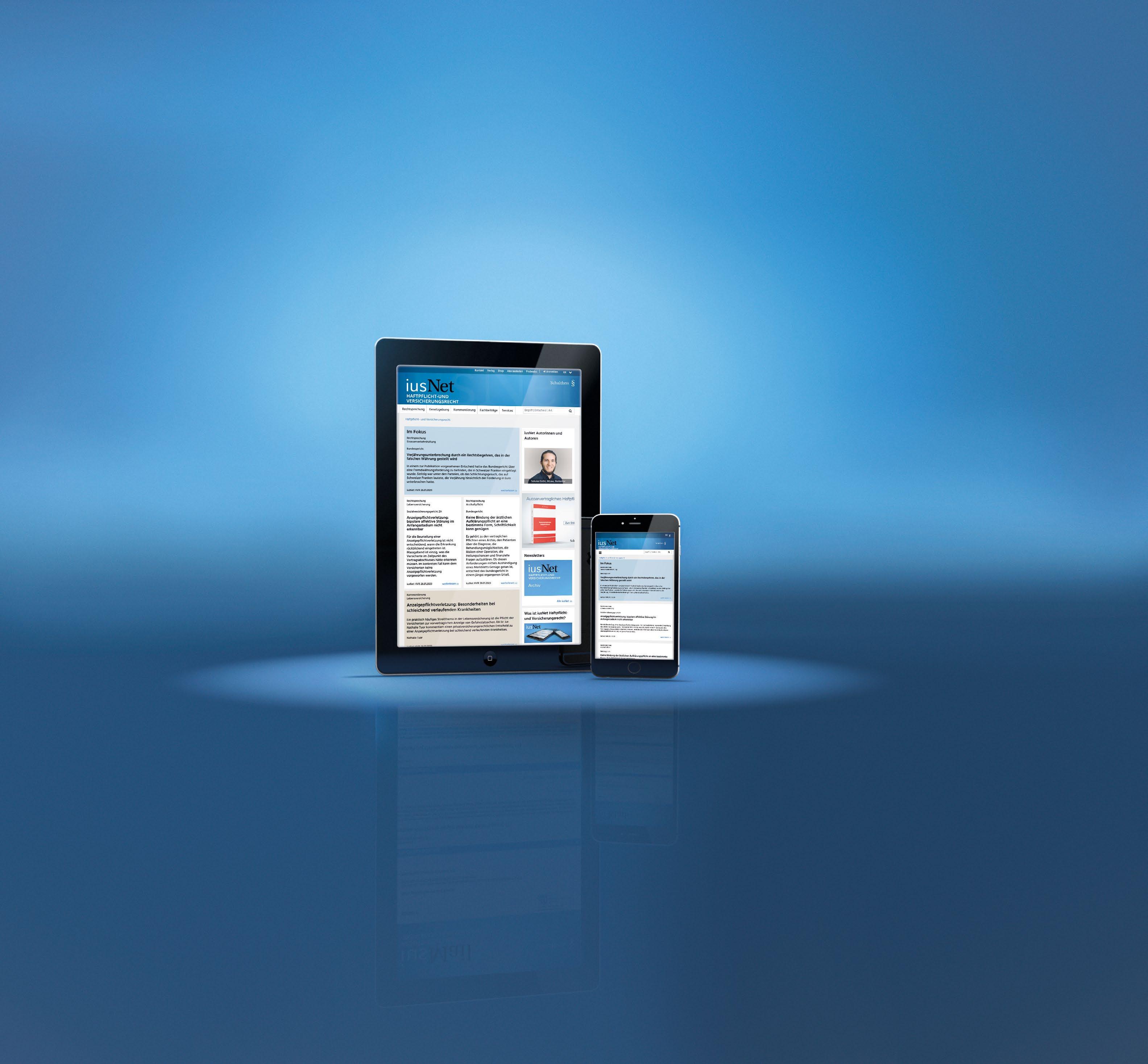 Das neue mehrstufige Informationssystem iusNet Haftpflicht- und Versicherungsrecht liefert Ihnen mit dem regelmässigen Newsletter sechs Mal jährlich einen kompakten Überblick über die wichtigsten Entwicklungen in Rechtsprechung und Gesetzgebung im Haftpflicht- und Versicherungsrecht. Die Online-Plattform iusNet Haftpflicht- und Versicherungsrecht enthält nebst sämtlichen Inhalten aus dem Newsletter weitere Entscheide, Informationen zu Gesetzgebung, Kommentierungen sowie Fachbeiträge. Eine hilfreiche Suchfunktion führt Sie treffsicher zu den gewünschten Ergebnissen. Weitere Mehrwerte bieten der Veranstaltungskalender sowie ein übersichtlicher Pressespiegel mit einer Auflistung der relevanten Fachartikel aus den juristischen Fachzeitschriften der Schweiz.