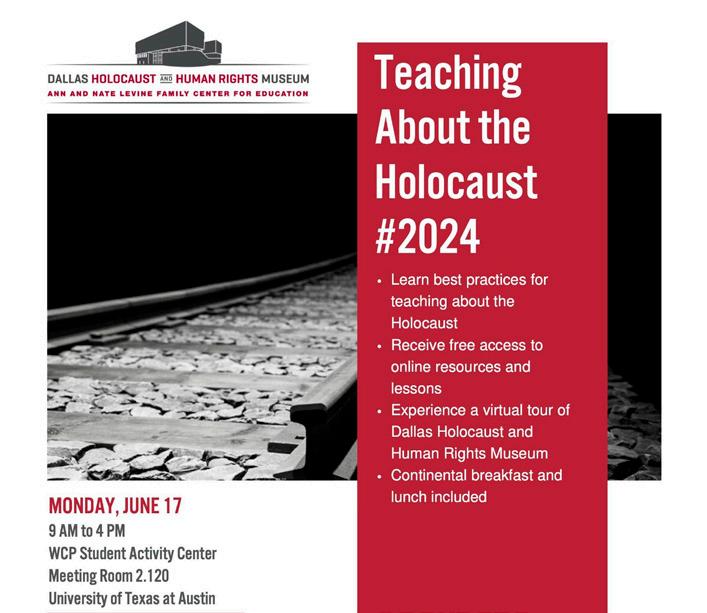 academic programs in Holocaust and Genocide Studies and Antisemitism. All participants were enriched by this professional development opportunity and look forward to bringing the lessons that they learned to their Central Texas classrooms.
