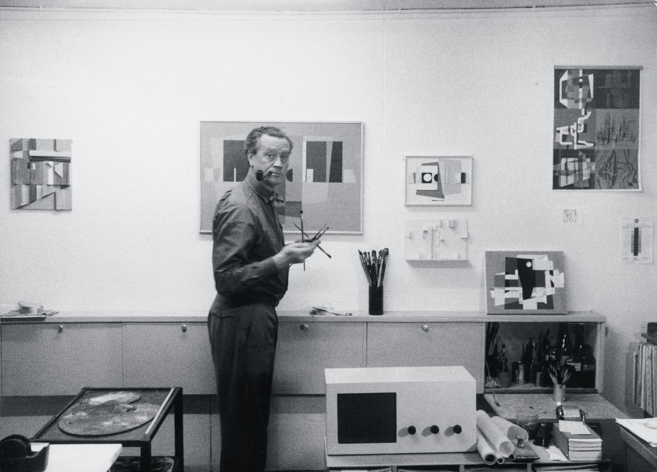 Der erste Beitrag in diesem Buch widmet sich der Gedankenwelt des Malers, Plastikers, Zeichners, Grafikers und Kunstlehrers Robert Salomon Gessner (1908–1982). Anhand einer Atelierfotografie von 1958 (Abb. 1) und eines unveröffentlichten Textes über die Kunst der Betrachtung,1 den Gessner rund zehn Jahre später verfasst hat, werden wir eine Künstlerpersönlichkeit kennenlernen, die lange Zeit im Schatten von bekannteren Namen wie Max Bill (1908–1994), Verena Loewensberg (1912–1986), Richard Paul Lohse (1902–1988), Camille Graeser (1892–1980), Gottfried Honegger (1917–2016), Hans Aeschbacher (1906–1980), Leo Leuppi (1893–1972), Hans Fischli (1909–1989) und Hans Erni (1909–2015) gestanden hat. Wir erinnern uns vielleicht noch an den Satz, den Eugen Gomringer 2011 in seiner Ansprache zur Eröffnung der Ausstellung Robert S. Gessner in der Villa Dessauer in Bamberg gesprochen hat: «Diese Kunst ist auf alle Fälle nicht mehr wegzudenken.»2 Notiert hatte Gomringer diesen Gedanken bereits 1951, als er die Gruppenausstellung Neue Malerei und Plastik aus Zürich3 in der Galerie Simmen in Bern zusammen mit Max Bill organisierte. Obschon Gessner sich selbst rückblickend als «lokalen Kleinerfolg» 4 einschätzte, wissen wir heute, dass seine Kunst die Landesgrenzen schon zu Lebzeiten mindestens achtmal überschritten hat: in Einzelausstellungen 1965 in Schwenningen am Neckar und Freiburg im Breisgau und ein letztes Mal 1970 in Köln; in Gruppenausstellungen schon 1954 in den USA, 1959 in Japan, 1966 in Frankfurt am Main, 1969 in Berlin und 1973 in Jerusalem. Gessner war