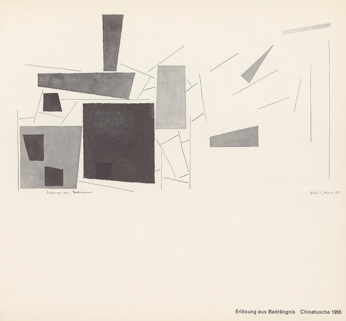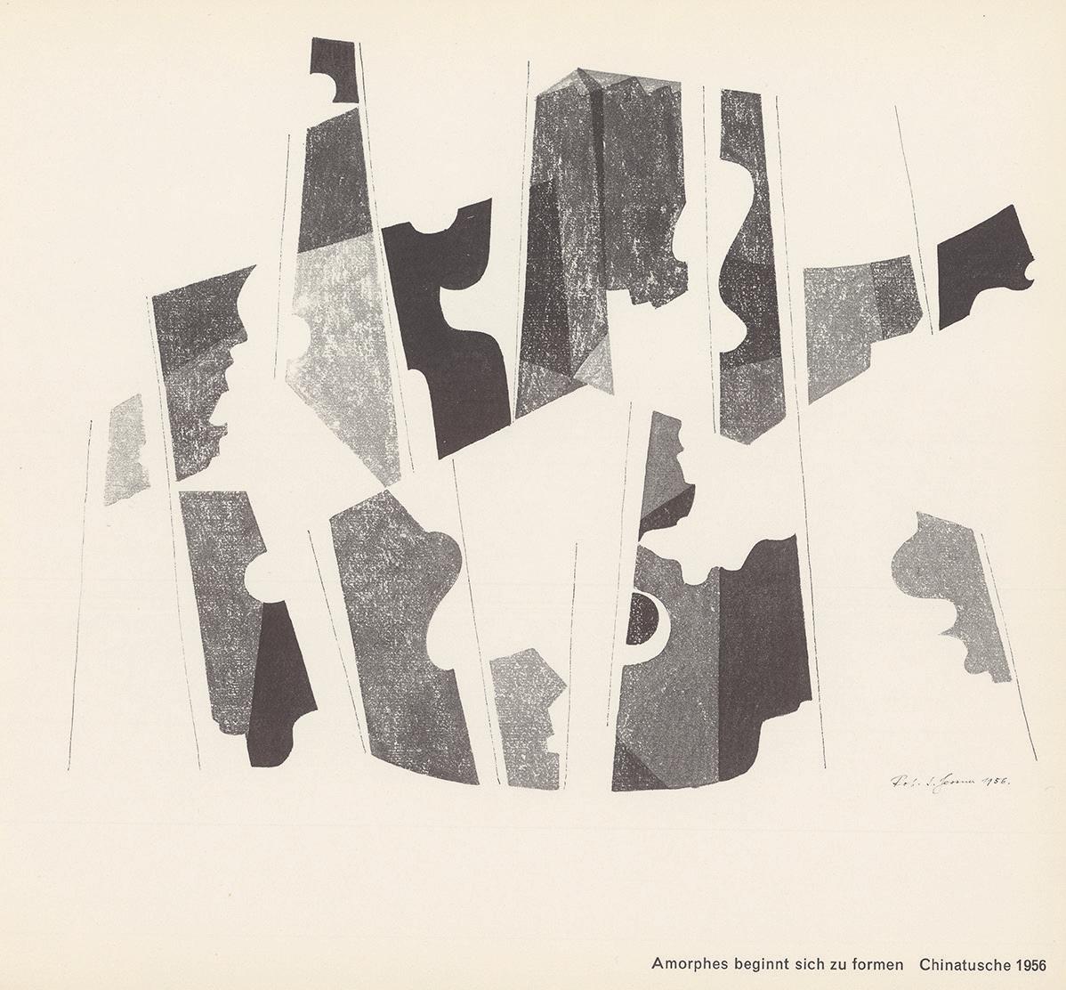 Abb. 3 Robert S. Gessner, Amorphes beginnt sich zu formen, 1956, Chinatusche, in: RSG, 24 Schwarzweißblätter, 1951–1956, Zürich 1958, Foto: Michael Wolgensinger