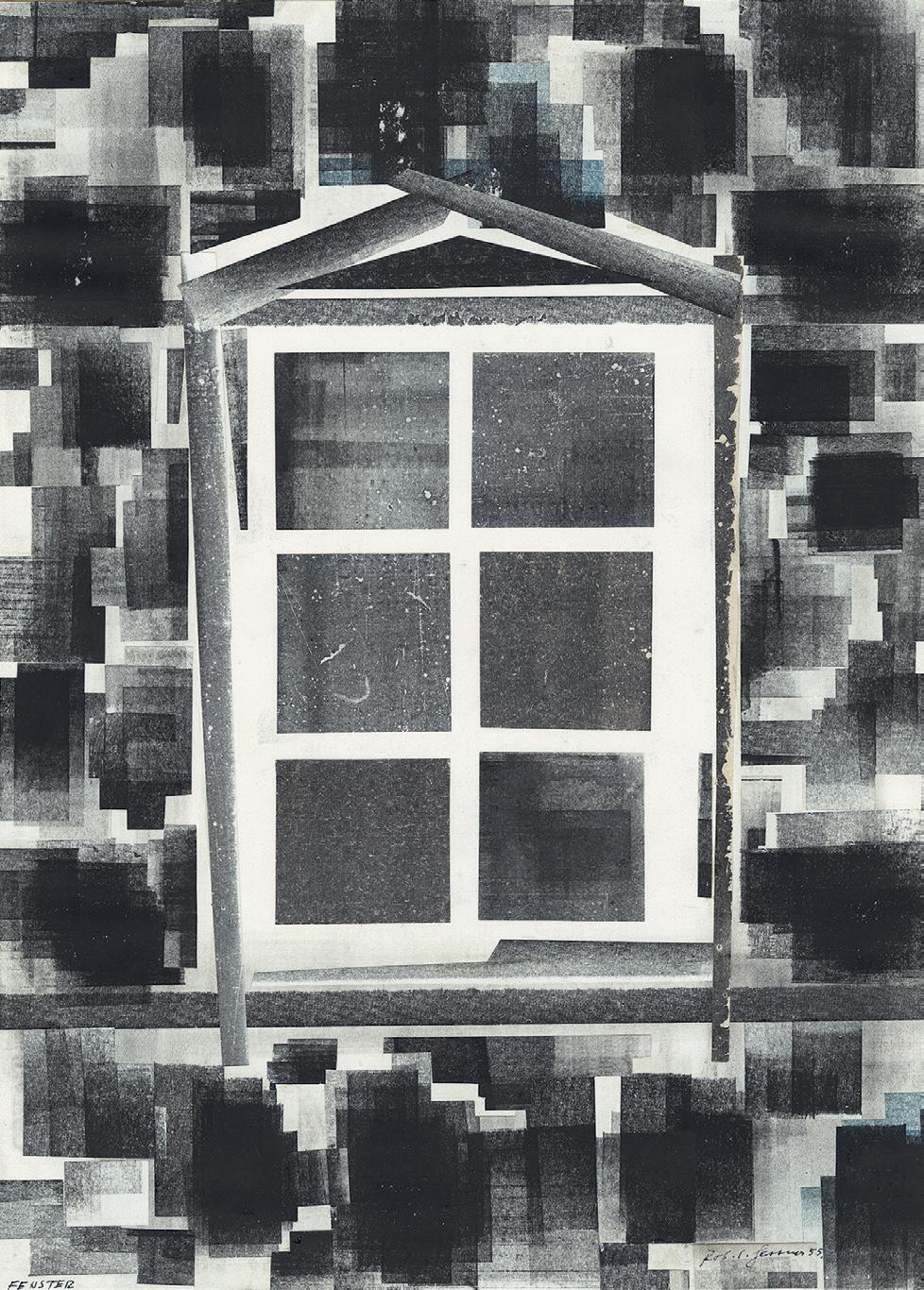 Man spürt diesen Fingerübungen noch an, dass sich Gessner schrittweise von übermächtigen Vorbildern befreien musste, um zu eigenen Bildfindungen vorzustossen. Dies gelingt ihm paradoxerweise mit zwei Collagen, die unterschiedlicher nicht sein könnten, beide sind 1955, im Jahr seines Vortrags homo ludens entstanden. Man erinnere sich an den Grundsatz, der Maler schaffe «weder aus dem Nichts – noch ohne Gesetze». In der Collage Fenster (Abb. 5, Kat. 41) wäre der Bildgegenstand auch ohne den vom Künstler gegebenen Titel unschwer zu erkennen. Doch schon beim zweiten Blick beschleichen uns