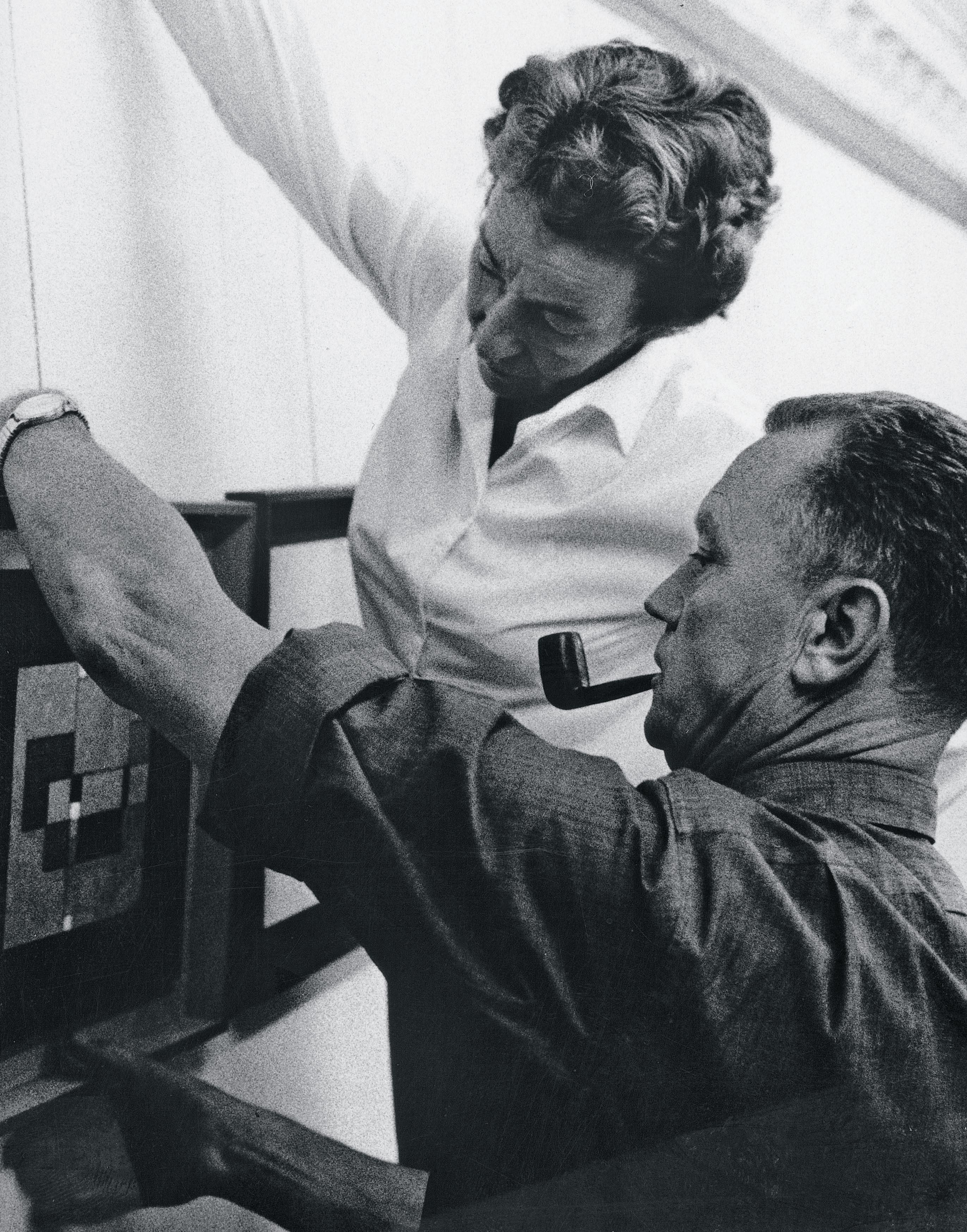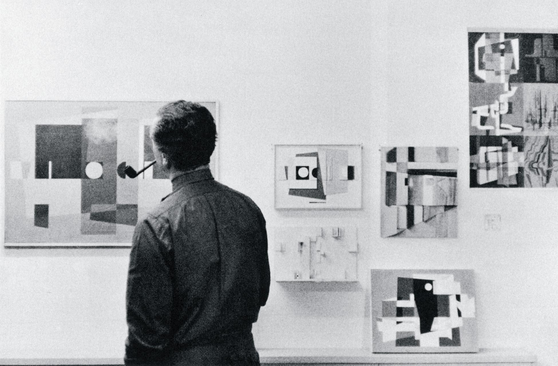 Wolgensingers Fotografie vermittelt allerdings ein etwas anderes Bild. Der Bildausschnitt ist so gewählt, dass kein Eindruck der Enge aufkommt. Im Gegenteil, nach beiden Seiten hin öffnet sich der Raum, es dominieren die Horizontalen und der Bildraum wird durch die asymmetrische Anordnung der Bilder und Reliefs, der Malutensilien und des Radioempfängers im Vordergrund rhythmisch aufgeladen.13 Aus diesem offenen und weiträumigen Ambiente wendet sich Gessner wie gewohnt mit Pfeife, dunklem Hemd und Fliege, vor allem aber mit griffbereiten Pinseln in der Linken, scheinbar etwas irritiert von der Arbeit ab und uns zu. Im Jahr zuvor hatte er die Stelle als Zeichnungslehrer in der Fachklasse Grafik in der Kunstgewerbeschule angetreten, die er bis 1963 beibehielt. Er wurde von seinen Schülern bewundert und schien seine neue Herausforderung zu geniessen.14 Sind wir bereit, so liesse sich sein skeptisch fragendes Schauen interpretieren, den stillen, wortlosen «Dialog» aufzunehmen und uns in seine abstrakte Kunst reflektierend einzufühlen? Welche Hilfsmittel stehen uns zur Verfügung? Wie viel Zeit und Energie müssen wir als Betrachtende aufbringen, um das SehAbenteuer zu bestehen, um in unserem Verständnis von Kunst bestärkt, vielleicht ein wenig wachgerüttelt oder gar angenehm überrascht zu werden?