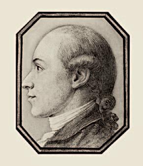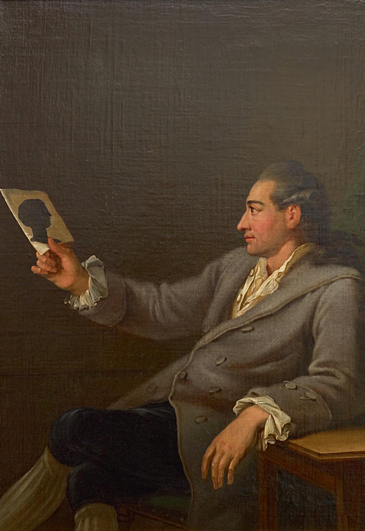 Goethe in Betrachtung einer Silhouette. Das Profilporträt des Frankfurter Kupferstechers und Malers Georg Melchior Kraus (1737–1806) entstand 1775/76. Die Schattenrisse sind im 18. Jahrhundert eine ungemein beliebte Darstellungsart. Man beachte Goethes konzentrier ten Blick trotz seiner entspannt lässigen Körperhaltung.