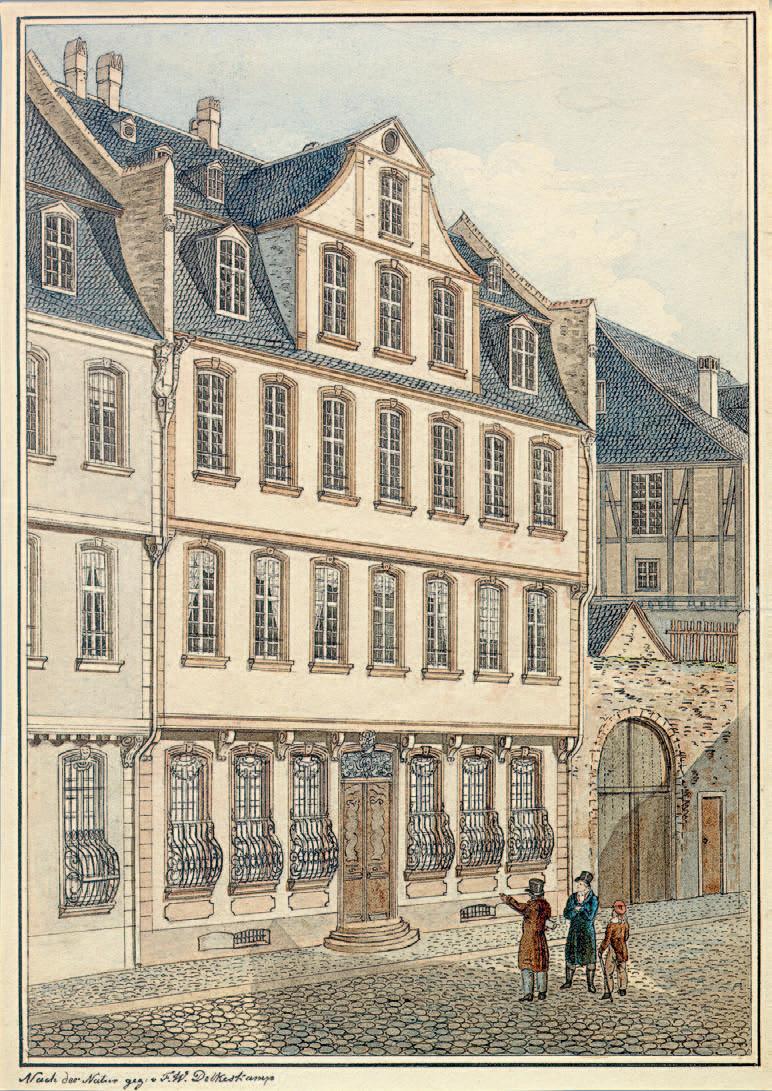 Haus am Großen Hirschgraben in Frankfurt am Main auf einem Aquarell von F. W. Delkeskamp, 1824. Goethe lebt nach dem Studienabschluss in Straßburg und dem Aufenthalt am Reichskammergericht in Wetzlar wieder in Frankfurt bei seinen Eltern. Von hier aus bricht er am 14. Mai 1775 zu seiner ersten Reise in die Schweiz auf.