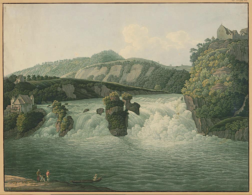 Der Rheinfall bei Schaffhausen: links die Schaffhauser, rechts die Zürcher Seite. Aquatinta von Johann Gottlieb Prestel, um 1775. Der Besuch des Rheinfalls ist im 18. Jahrhundert ein absolutes Muss für alle Schweizreisenden. Auch Goethe wird dieses Naturphänomen auf jeder seiner drei Schweizer Reisen aufsuchen und bewundern.