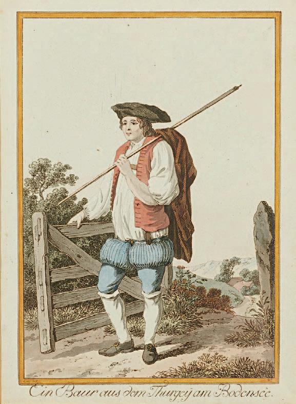 Thurgauer Bauer in Tracht, von Gabriel Lory d. Ä. und Marquard Wocher. Im 18. Jahrhundert wächst in Deutschland die Begeisterung für die Schweiz und ihre freiheitlichen Traditionen stetig. Lavaters Schweizerlieder (1767) verstärken diese positive Sicht auf die Eidgenossen. Sie prägt auch die Gespräche der jungen Adligen mit den Bauern am Wegrand.