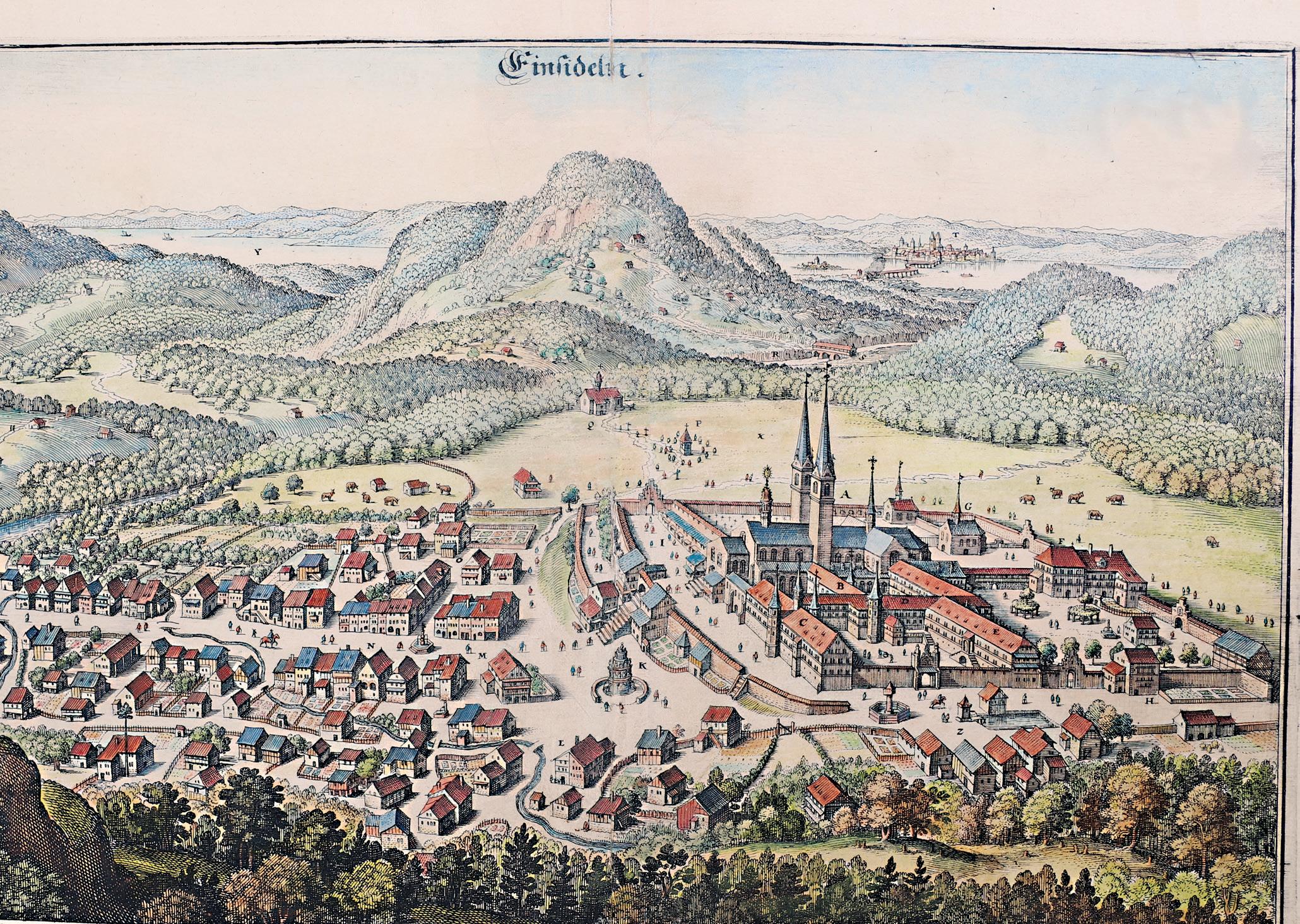 Am 31. März 1704 begab sich der EinsiedlerFürstabt Maurus von Roll (1653–1714, Abt 1698–1714)inBegleitung mehrerer Mönche vor den damaligenKonventbau und initiierte mit einem symbolischen Spatenstich offiziell die Arbeiten für den barocken Neubau.1 Diese Handlung stellte ohne Zweifel eine Zäsur in der Geschichte des Klosters Einsiedeln dar, zumal sie den Ausgangspunkt für den beeindruckenden Bau markierte, in dessen Mitte eine zweitürmige Stiftskirche steht. Mit ihrer prunkvollen Westfassade, dem einmaligenInnenraum und der Gnadenkapelle mit der Schwarzen Madonna zieht sie noch heute jährlich tausende von Pilgern und Besuchern an. Das Neubau-Projekt war für die Ordensgemeinschaft von ausserordentlicher Bedeutung, weshalb weder Kostennoch Mühen gescheut wurden. Der barocke Prachtbau sollte das Selbstbewusstsein einer wiedererstarkten Klostergemeinschaft sichtbar machen, die in der Reformationszeit beinahe aufgelöst worden wäre. Im grösseren Rahmen spiegelt sich darin auch die Aufbruchsstimmung fast allereidgenössischen Benediktinerklöster wider, welche im 17. und 18. Jahrhundert in zahlreiche Bauprojekte mündete.