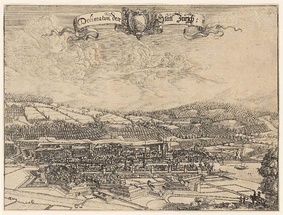 Fünf Monate bevor Conrad Meyer das Licht der Welt erblickte, ereignete sich in Böhmen der sogenannte Prager Fenstersturz. Diese handgreifliche Eskalation zwischen dem protestantischen und dem katholischen Lager entfachte einen drei Jahrzehnte währenden Krieg, der in der Folge weite Teile Mitteleuropas in ein riesiges Schlachtfeld verwandelte, auf dem auch viele eidgenössische Söldner ihr Leben liessen.2 Verschiedene Schweizer Städte reagierten auf diesen Konflikt mit dem Ausbau ihrer Befestigungsanlagen, so auch Zürich ab 1642.3 Conrad Meyer sollte sich später auf vielfältige Weise mit diesen kriegerischen Umständen seiner Zeit beschäftigen. In zahlreichen Zeichnungen und Radierungen hielt er die
