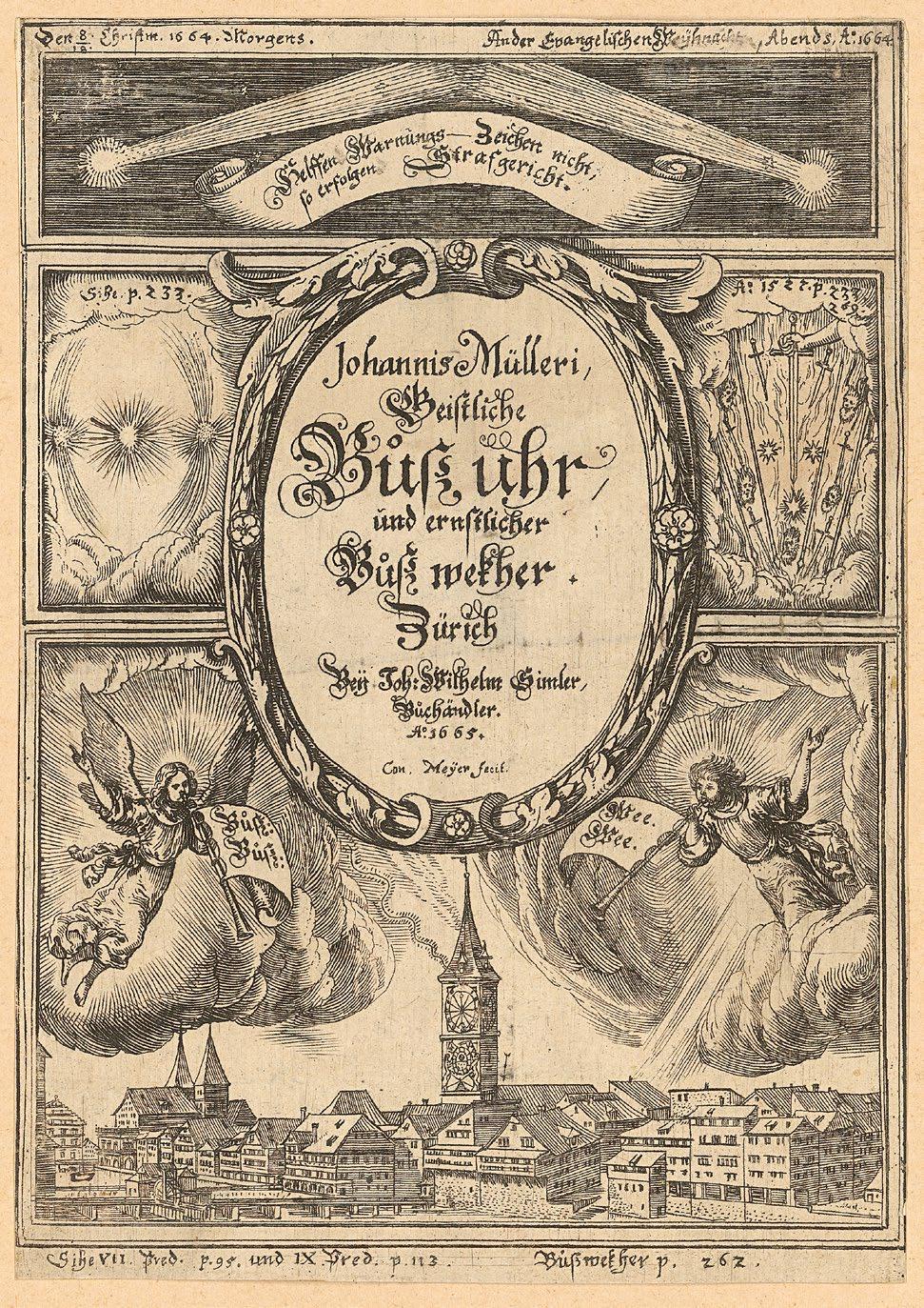 Abb. 3 | Conrad Meyer, Geistliche Buoß-Uhr…, 1665, Radierung, 18 × 13 cm, Kupfertitel, in: Johannes Müller, Geistliche Buoß-Uhr, und ernstlicher Buoß wekher, Zürich 1665, Zentralbibliothek Zürich, Graphische Sammlung und Fotoarchiv, Zürich K1, Schipfe I, 2