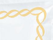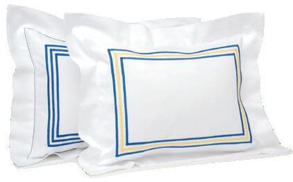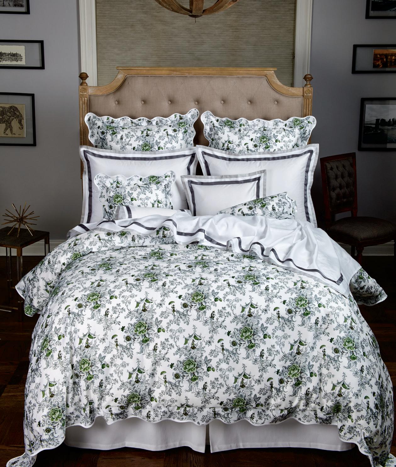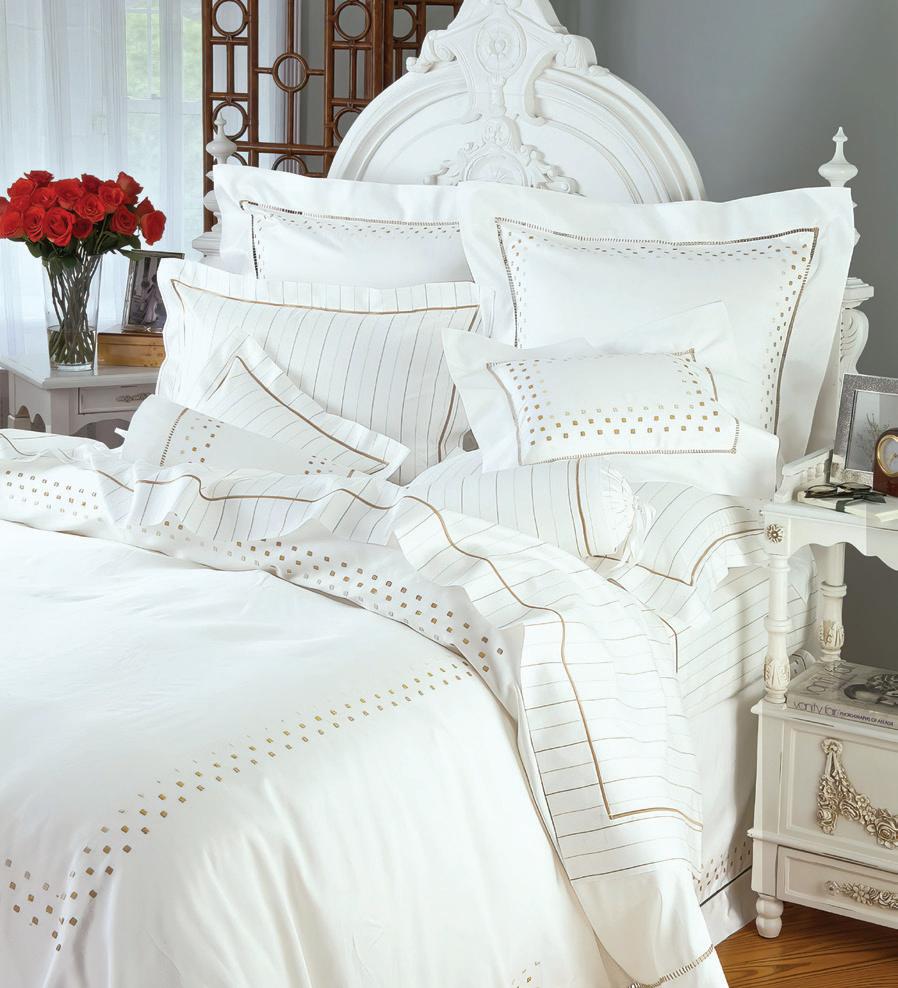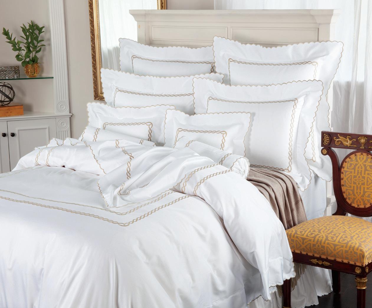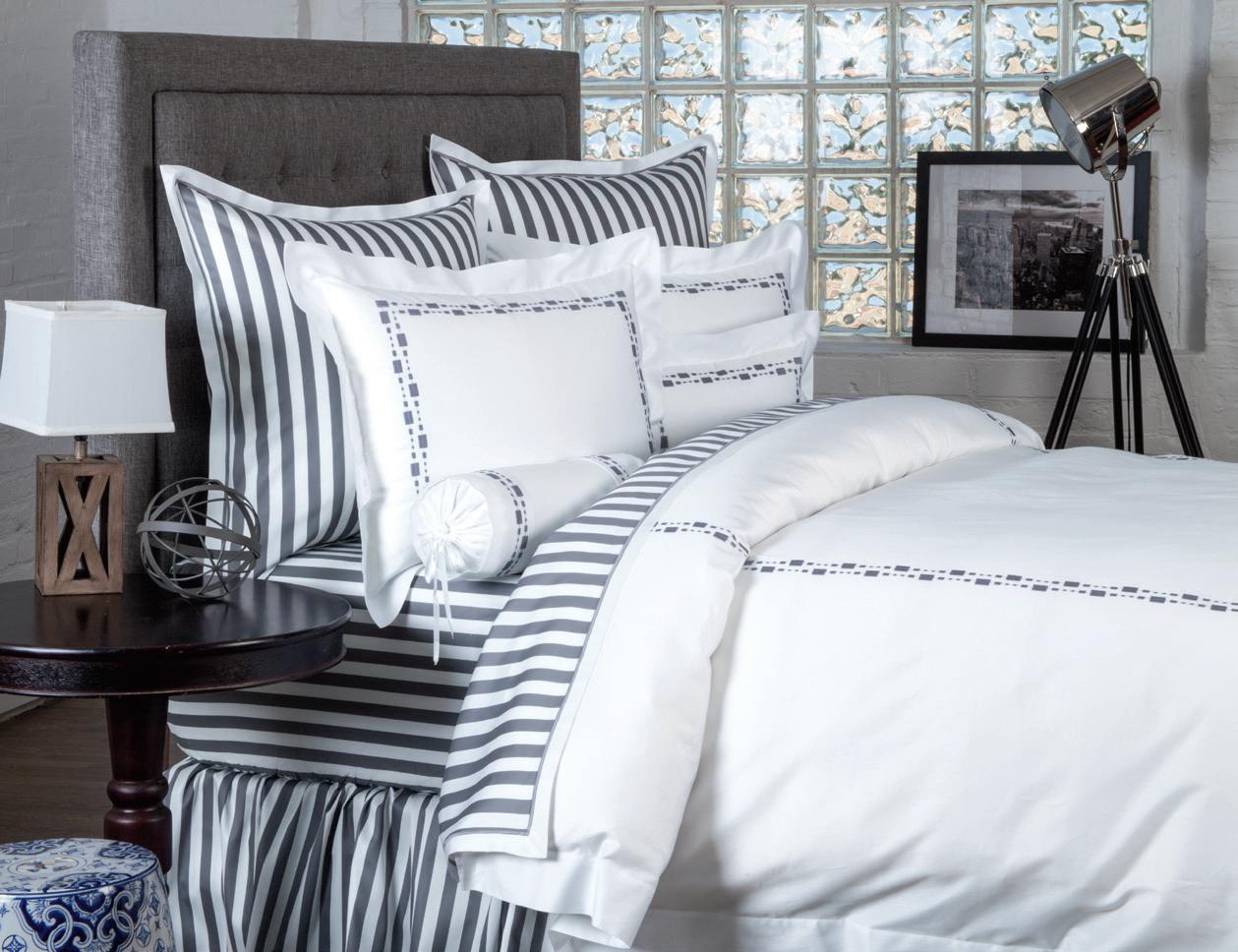 True elegance is expressed in the polished texture of silky 300 thread count, White Egyptian cotton sateen, with finely delineated rows of pin tucks and cords in Gray, Beige, Blue or Rose on White, or Beige on Ivory, and a frame of ultra-fine zigzag stitching. Made in Italy with the tailoring refinements of knife-edged flanges, mitered corners and button enclosures on the shams and duvet covers. Truly exceptional.