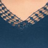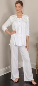 he loving care that goes into this gown is matched only by the love you will feel when you wear it. Made of silky smooth pima cotton jersey in pure White, it boasts famed Peruvian craftsmanship in captivating hand crocheted sleeves, and hand crocheted edging, woven with satiny ribbon around a neck that is open to compliments.