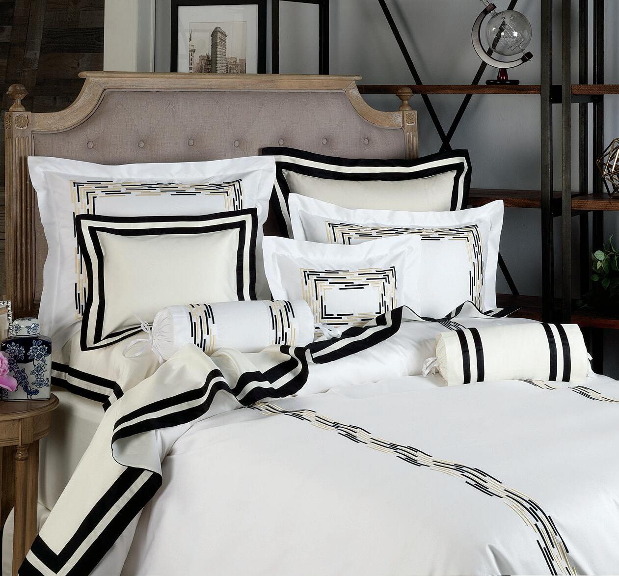 Going to extremes for utmost elegance, fine Italian craftsmanship contrasts luminous Ivory with lustrous Black Onyx. Made of finest 100% Egyptian cotton sateen, 600 thread count, with a smooth-as-silk touch, the splendor is tailored with great care—from precise triple-border flanges to button closures on the shams.