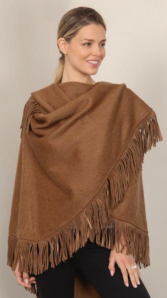 rom the rare suri alpaca comes a fiber so revered for its soft touch and natural sheen, it’s in a class of its own. We used the same legendary fabric to make this stunning shawl and added genuine suede fringes to further complement the chic design. 70% suri alpaca and 30% merino wool. One-size-fits-most. Made in Peru.