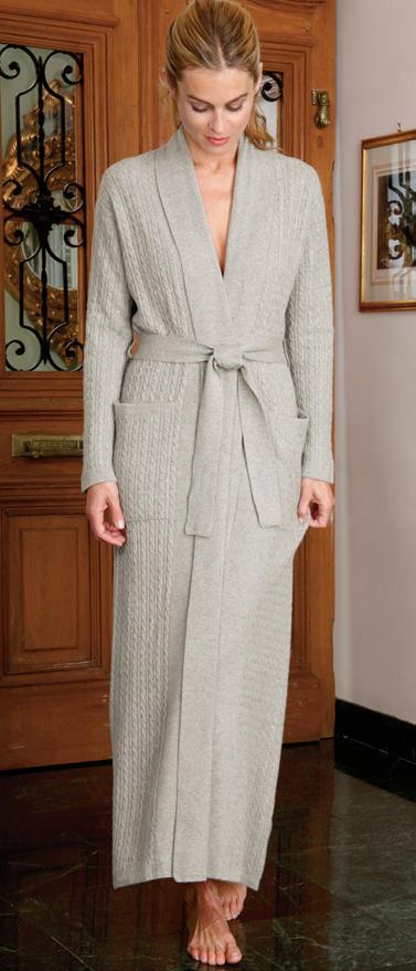 hen the snowflakes begin to fall, every curve of your body will cherish the textured weave of this luscious, 760 grams , 100% cashmere robe. Designed with your comfort in mind, it features a shawl collar to keep the chill off your neck and cozy patch pockets to warm your hands. Thick, exquisitely soft, and tailored for a body skimming fit, this imported robe will be your constant companion each morning and night. Available in Gray or Beige.
