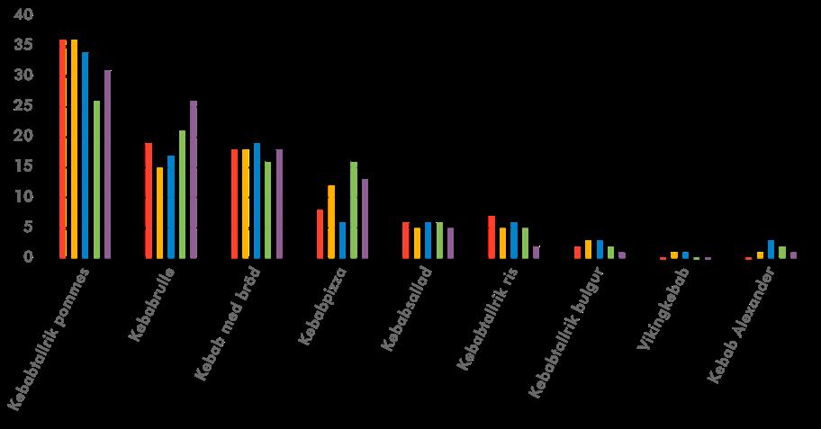 Kebabtallriken med pommes är populärast i år igen. Men årets trend är bröd i olika former och framförallt Kebabrullen har tagit Sverige med storm. Förra årets jumbo Kebab Alexander, som en kebabtallrik fast med skurna brödbitar, gör också ett hopp upp. De mer kaloririka varianterna kebabtallrik med pommes, kebabpizza och nya jumbon Vikingkebab tappar alla i popularitet. Kebabsallad och kebab med ris eller bulgur står kvar på samma nivåer som föregående år.