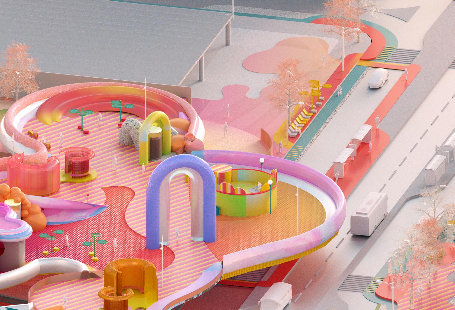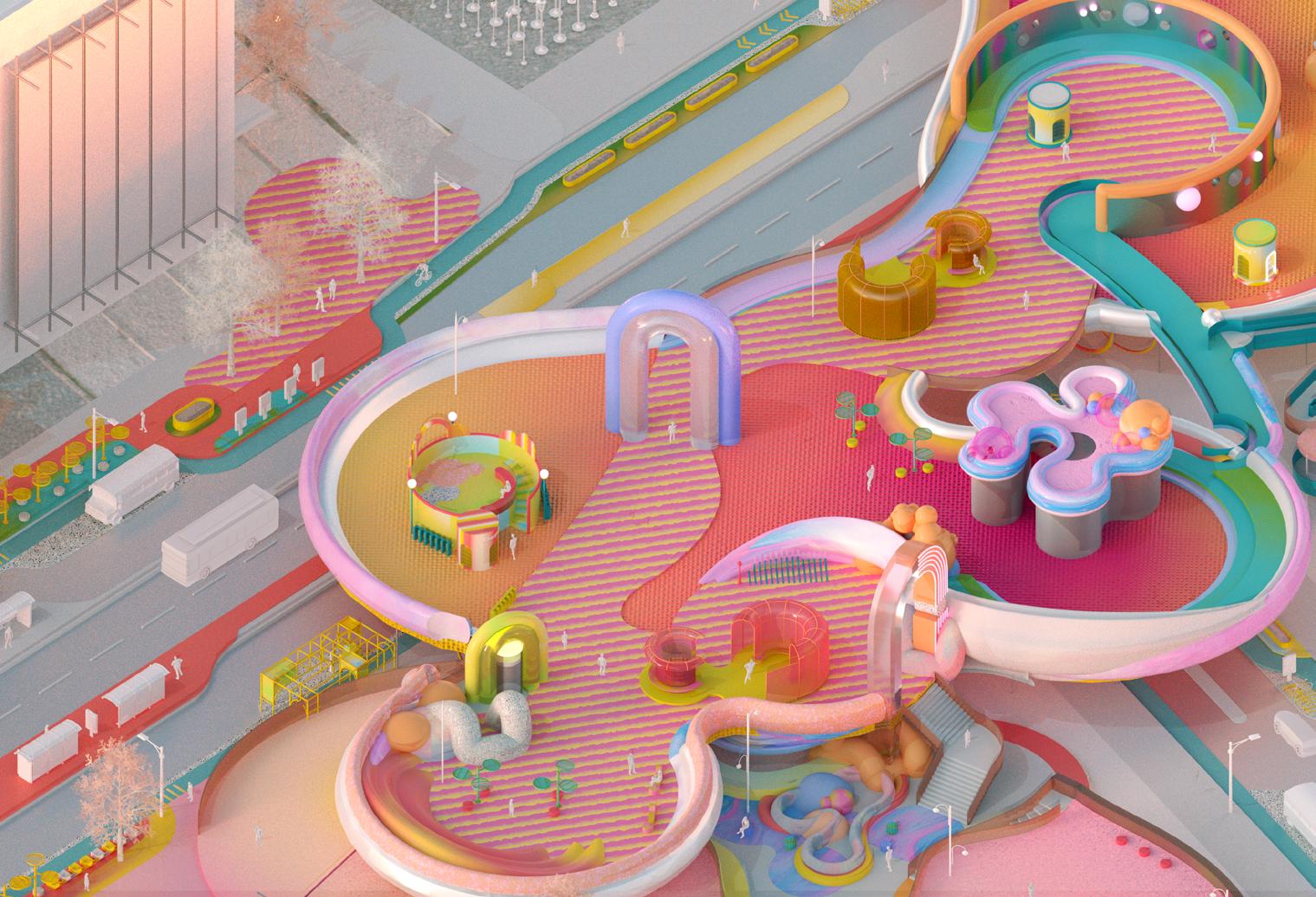 The project will be a combination of elevated pavilion with pop-up installations with painted scapes that transcends between digital and physical characteristics.