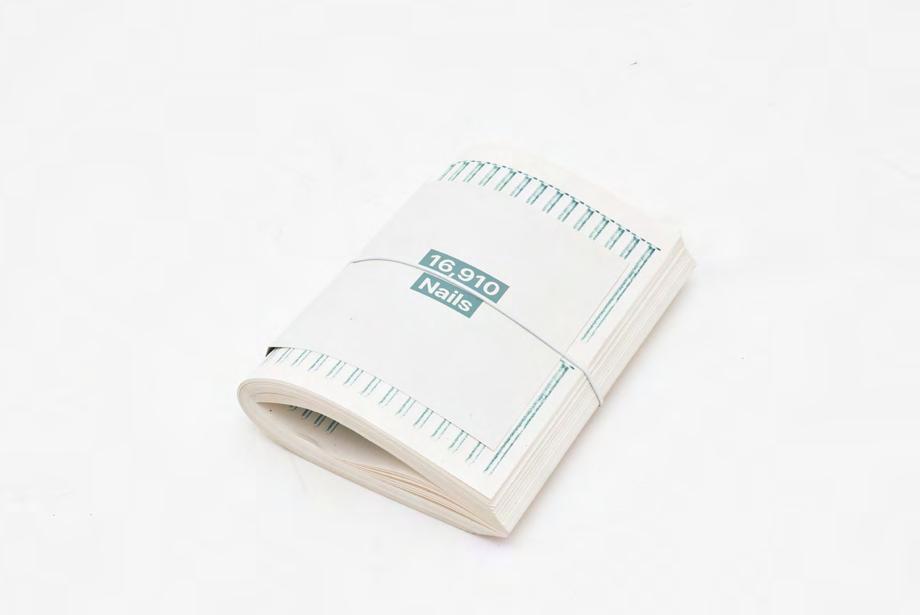 A book containing a collection of 16,910 nails used to construct the Lieb House by Venturi Scott Brown & Associates. The 84 pages are loosely binded and folded into a single signature with its creep untrimmed.