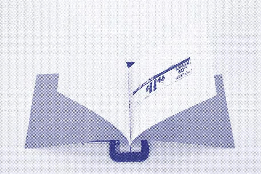 The clamp bound book contains a selection of Home Depot price tags of building materials found from the Frank Gehry’s Arnoldi Triplex in Venice. Built and inspired by artist friends of Gehry, the triplex was made with intentionally cheap and sometimes unconventional building materials. Over time the triplex’s materials have decayed requiring a constant maintenance of the houses. Most recently the operable windows of the triplex were replaced with inoperable ones due to the beach air of Venice hindering their operability. The pages of the book are held in place by two pieces of plywood viced together. The binding restricts the book from fully opening up and laying flat.