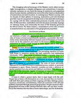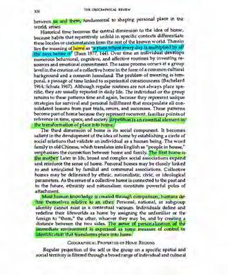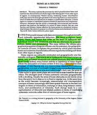 Home as a Region by Theano S. Terkenli lays out the underlying hierarchies embedded within ‘home’ at all scales. ‘Home’ is defined as “A place where every day is multiplied by all the days before it” (Terkenli 326). The first ‘home’ is the mother and as we gain life experience the region we call home expands with it. In the way Bachelard’s Oneiric House describes ‘home’ as a shelter for continual day dreaming, Terkenli argues for the ‘home’ as a dynamic relationship between our understanding of what falls within the interior and our geographical understanding of the world.