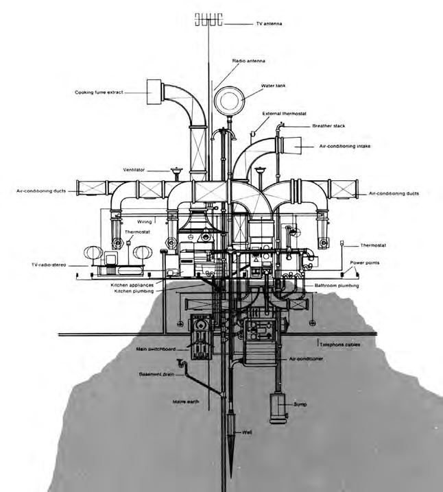 Reyner Banham and Francois Dallegret (1965) diagram the implications of these systems by erasing away all of the characteristics of home that don't serve, transfer, or generate the life supporting systems that allow the dwelling to be comfortable and suitable for continual inhabitance. The extents of the diagram penetrate the earth and reach towards the sky harvesting and exhausting energy continually.