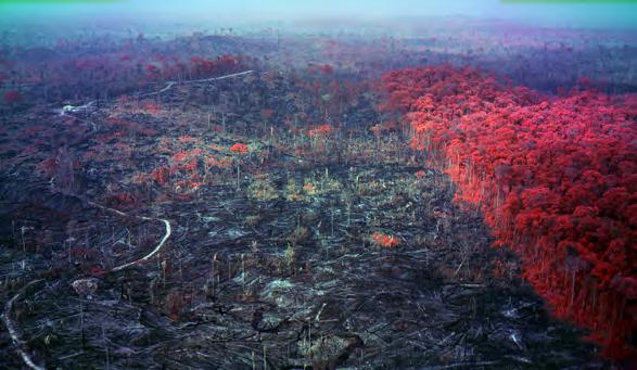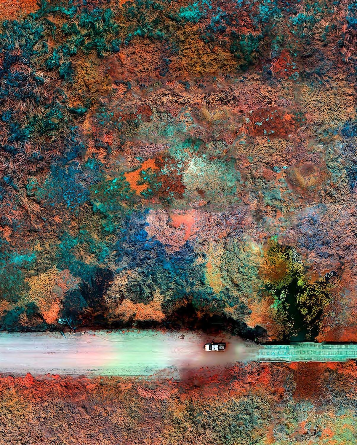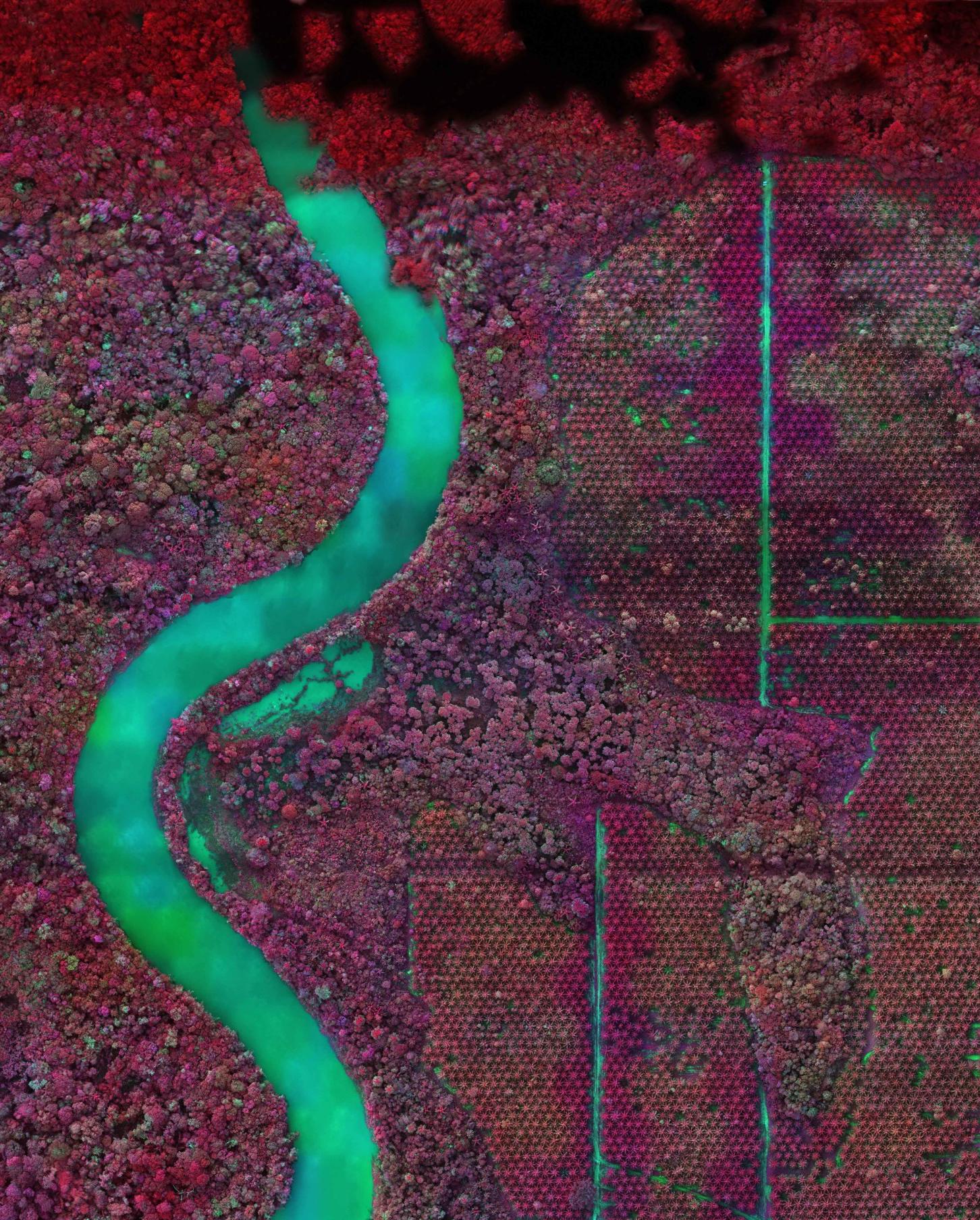 The use of surveillance technology in environmental conservation has become increasingly important in recent years as the world faces a growing number of environmental challenges. With satellite imagery, drones, and other forms of remote sensing, conservation organizations and governments are able to gather data and monitor changes to ecosystems and wildlife populations in near-real time. This data is used to identify areas in need of protection, track illegal activities such as deforestation and wildlife poaching, and monitor the effectiveness of conservation efforts. Mosse’s use of high-resolution aerial photography to document the destruction of the Amazon rainforest in South America provides a bird's-eye view of the rainforest and a unique perspective on the scale and impact of deforestation in the region. These aerial images capture vast areas of land that have been cleared for agriculture, mining, and other uses. Each of these psychedelic images remains objective in its efforts to bring attention to the devastating impact that human activities are having on the Amazon rainforest and its indigenous communities. The images are both beautiful and haunting, highlighting the delicate balance between nature and human intervention.