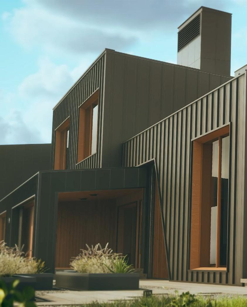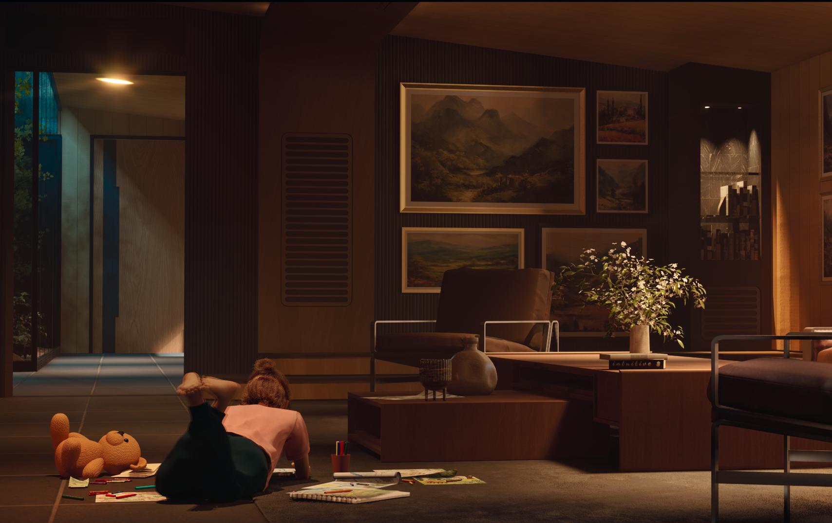 The home in the film acts as a visual storyteller, adapting to the family's actions and surroundings. Designed by Praesidium, the home is part of a small, remote community of similar homes, all specially designed to resist the effects of a multitude of natural disasters within the region. The interior boasts cutting-edge technology for temperature control, lighting, cleaning, organization, and entertainment. A certain uncanniness perpetuates throughout the living spaces. The room’s walls, ceiling, and floor are strangely deformed and interrupted by random extruded volumes covered in an array of vents. Furniture wraps and adjusts to these extrusions establishing a sense of normalcy to the presence of these extrusions. Overall, comfort is an everpresent theme throughout the entire residence.