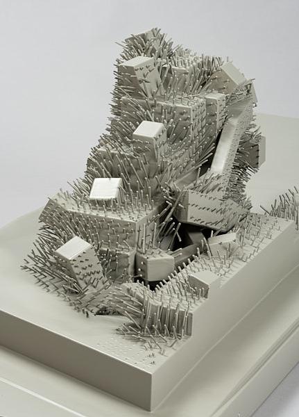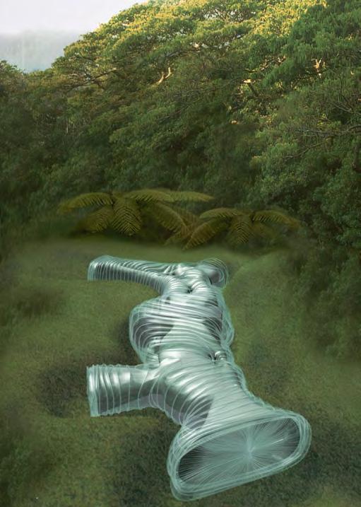 Images of being overcome and completely immersed within a pool of grey goo incite feelings of horror and anxiety as one is disillusioned by the fact that there is no such thing as an ‘away’ or ‘over yonder’ where this goo exist. Highly optimized systems of flow and exchange that circulate this grey goo (aka waste, contaminated air, heat, etc.) will eventually reach a moment of obsolescence when the overwhelming load of climactic detriment begins to outweigh the fortifying capacity of our shelled enclosures. Dusty Relief (2002), a proposal for a contemporary art museum within the city of Bangkok, exploits this cohabitation with the grey goo through a literal attraction of waste byproducts into the composition of the façade. By using a combination of aluminum cladding and an embedded electrostatic system within the exterior structure, the museum progressively transforms into a hairy blob from collected dust particulates floating in the air. The buildup of material is flaunted as a visual exposure of the goo that permeates invariably through the city, and through this exposure, good matter and bad matter become interchangeable; reduced simply to just matter. Likewise, the work of Gordon Matta Clark, employs tactics of exposure within architecture through literal acts of splicing, shifting, and removing elements within existing buildings. In the case of Splitting(1974), the slicing of the home transforms the space that was once a threedimensional array of surfaces into thresholds with layers of materials. These materials carry with them complex narratives of exchange, origins, and a vast degree of ecological implications.