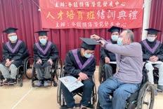結訓這天,結訓的學員都穿上學士服來代表自 己完成生活重建並即將邁入新人生的階段,中心 也特別邀請家屬以及一些曾經來中心參訪的捐助 者,共同參加結訓典禮。從每位學生的感言與影 片中看到學員們的蛻變與進步,學習過程中不放棄 的精神、同學間的互助情誼…等,也共同見證了從 依賴無助的心境到可以自立生活,心中滿是感動。