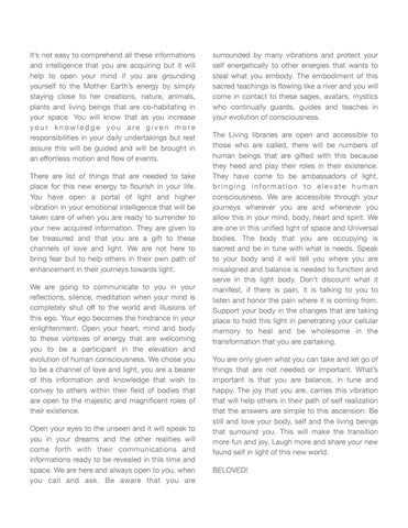 The Living libraries are open and accessible to those who are called, there will be numbers of human beings that are gifted with this because they heed and play their roles in their existence. They have come to be ambassadors of light, bringing information to elevate human consciousness. We are accessible through your journeys wherever you are and whenever you allow this in your mind, body, heart and spirit. We are one in this uni ed light of space and Universal bodies. The body that you are occupying is sacred and be in tune with what is needs. Speak to your body and it will tell you where you are misaligned and balance is needed to function and serve in this light body. Don’t discount what it manifest, if there is pain, it is talking to you to listen and honor the pain where it is coming from. Support your body in the changes that are taking place to hold this light in penetrating your cellular memory to heal and be wholesome in the transformation that you are partaking.