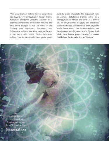 hunt the spirits of buffalo. The Gilgamesh epic, an ancient Babylonian legend, refers to a resting place of heroes and hints at a tree of life. In the pyramids of Egypt, the embalmed bodies had maps placed beside them as guides to the future world. The Romans believed that the righteous would picnic in the Elysian fields while their horses grazed nearby.” - Alcorn (2004) from the introduction to “Heaven"